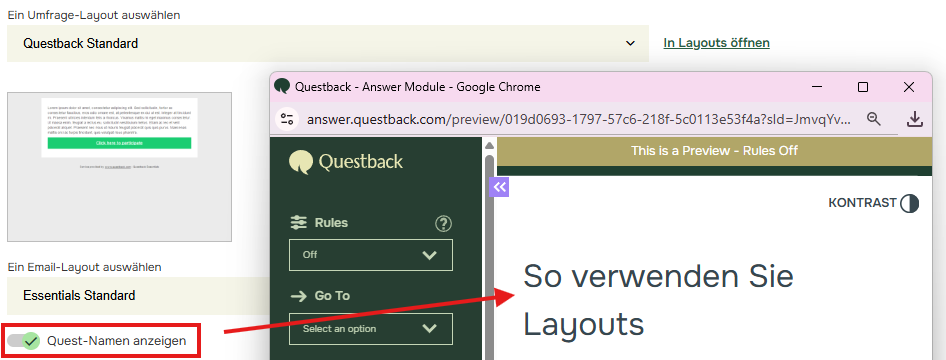 Quest-Name anzeigen: Aktivieren Sie diese Option, wenn der Name der Quest in der Umfrage sichtbar sein soll. Der Quest-Name wird auf allen Seiten der Quest angezeigt. Sie können dies in der Vorschau der Quest einsehen.