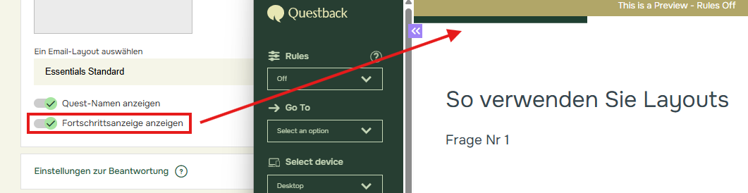 Fortschrittsbalken anzeigen: Aktivieren Sie diese Option, wenn während der Beantwortung der Quest ein Fortschrittsbalken am unteren Rand angezeigt werden soll. Der Fortschrittsbalken zeigt den Abschlussgrad basierend auf der Anzahl der verbleibenden Seiten an.