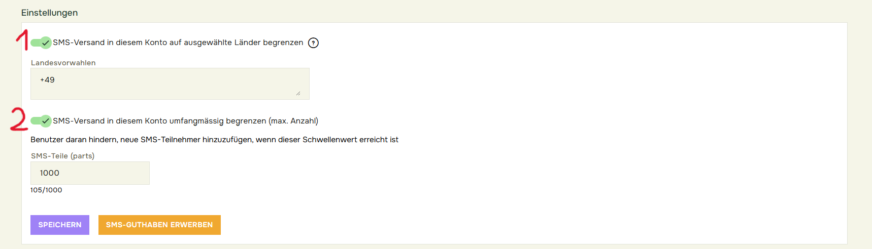 - Sie können auch die Gesamtzahl der SMS-Nachrichten begrenzen, die Ihr Kontonutzer versenden darf. Darüber hinaus können Sie einen Schwellenwert für den maximal zulässigen SMS-Versand festlegen.