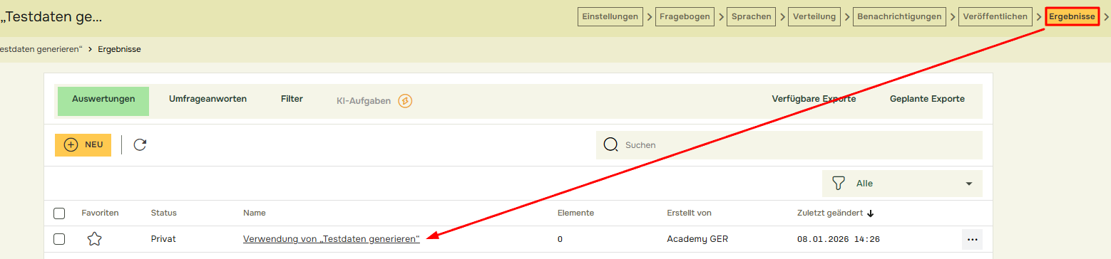Um mit den generierten Testantworten zu interagieren, klicken Sie im Menü auf „Ergebnisse“ und wählen Sie entweder den automatisch erstellten Bericht aus oder erstellen einen neuen.