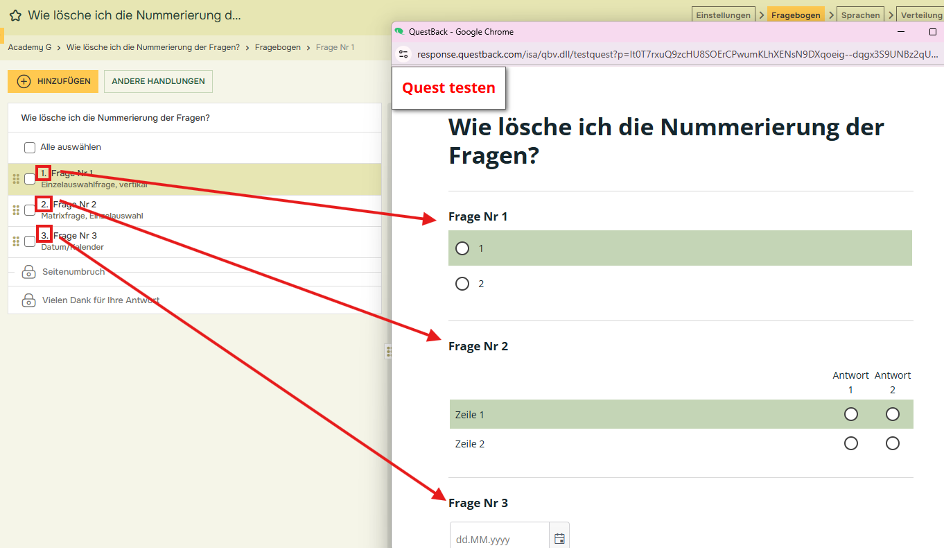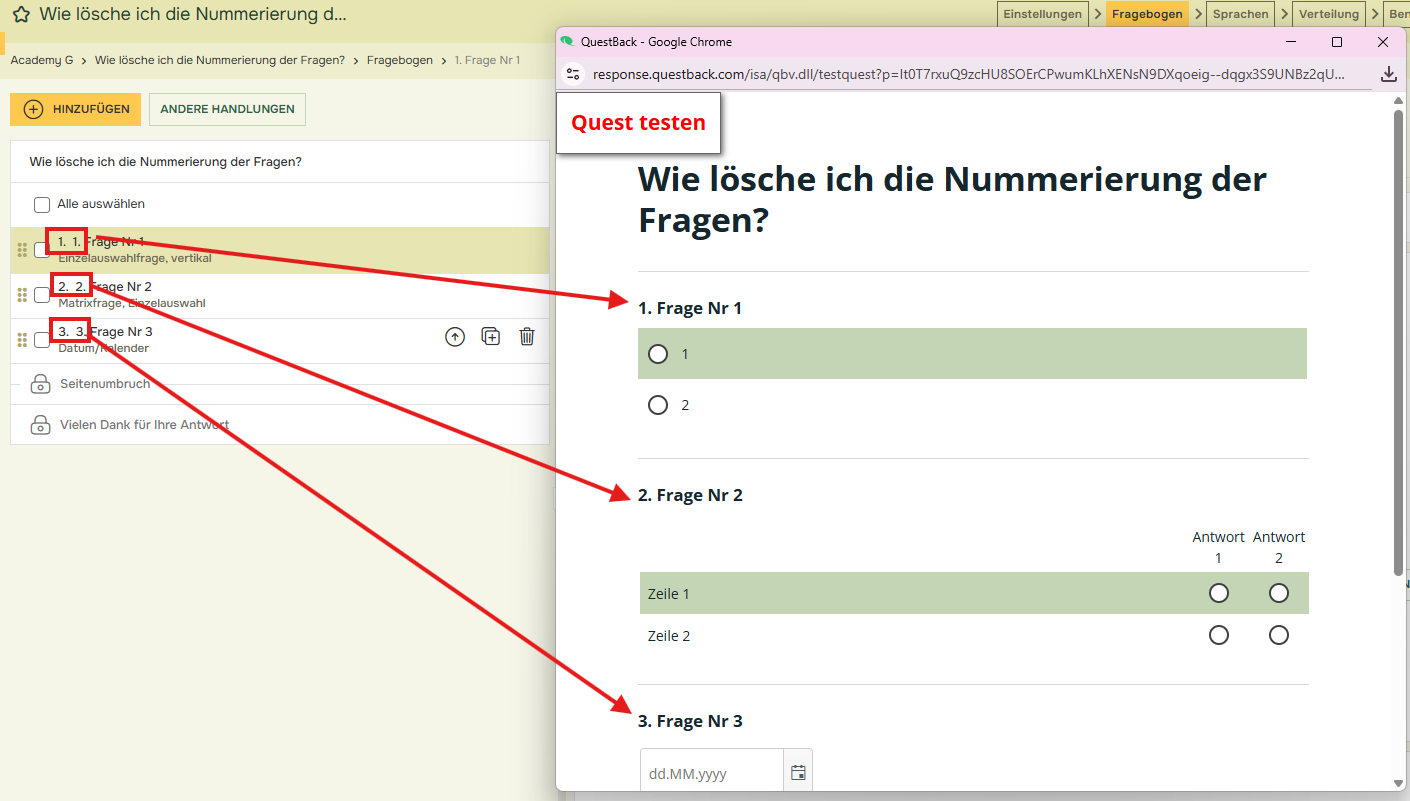 - Wenn Sie die Nummerierung vor den Fragen beibehalten möchten, müssen Sie die Nummer manuell am Anfang des Fragetextes hinzufügen.