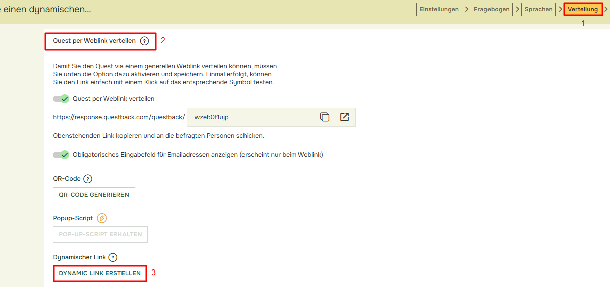 1. Vergewissern Sie sich bei Ihrer lokalen Questback-Niederlassung, dass die Funktion „Dynamische Links” für Ihr Konto aktiviert ist.