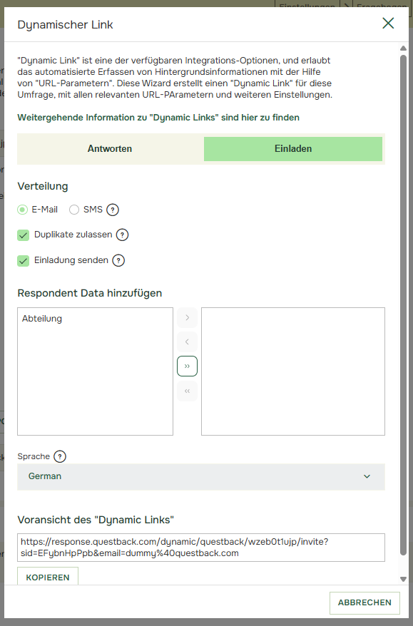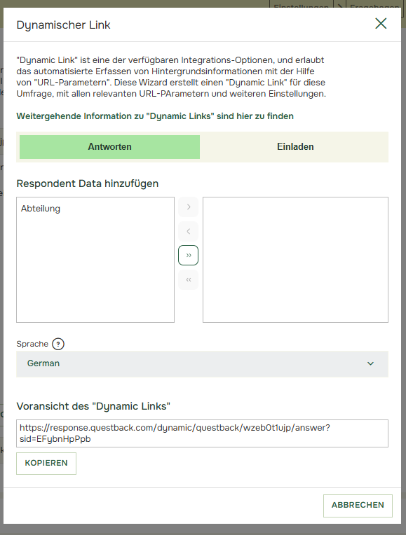 b. Respondenten Daten können mit den Pfeiltasten zum dynamischen Link hinzugefügt und daraus entfernt werden.