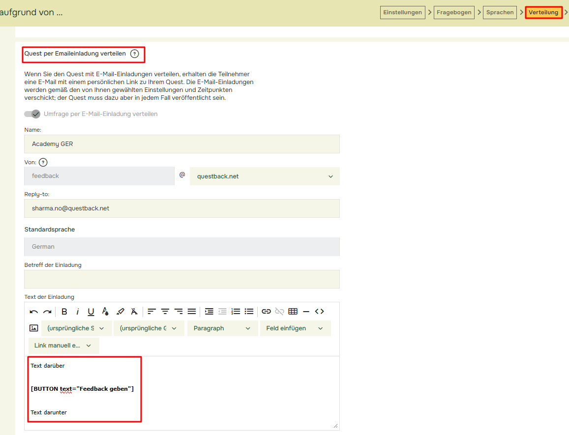 - Sie können den Text auf der Schaltfläche beliebig anpassen, damit er zum Stil Ihrer Einladung passt.Ändern Sie den Text auf der Schaltfläche, indem Sie zu „Verteilung” und „Quest per Emaileinladung verteilen” gehen. Fügen Sie im Text der E-Mail-Einladung Folgendes hinzu: [BUTTON text=“Feedback geben“]