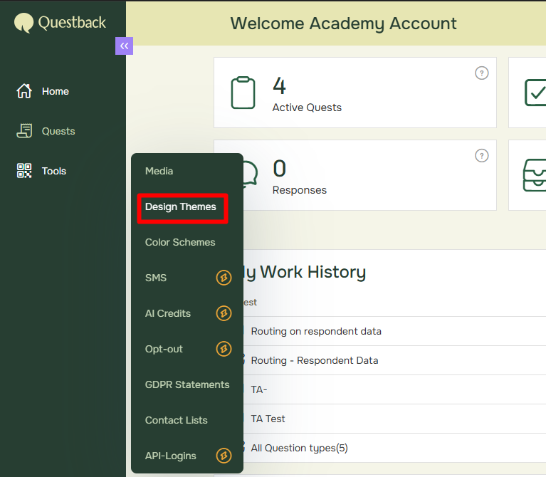 • To generate a theme with your company brand open Tools in the left-hand menu, select Design Themes