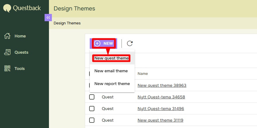 • Click New and select New Quest theme, remember to give your newly created theme a fitting name before proceeding: