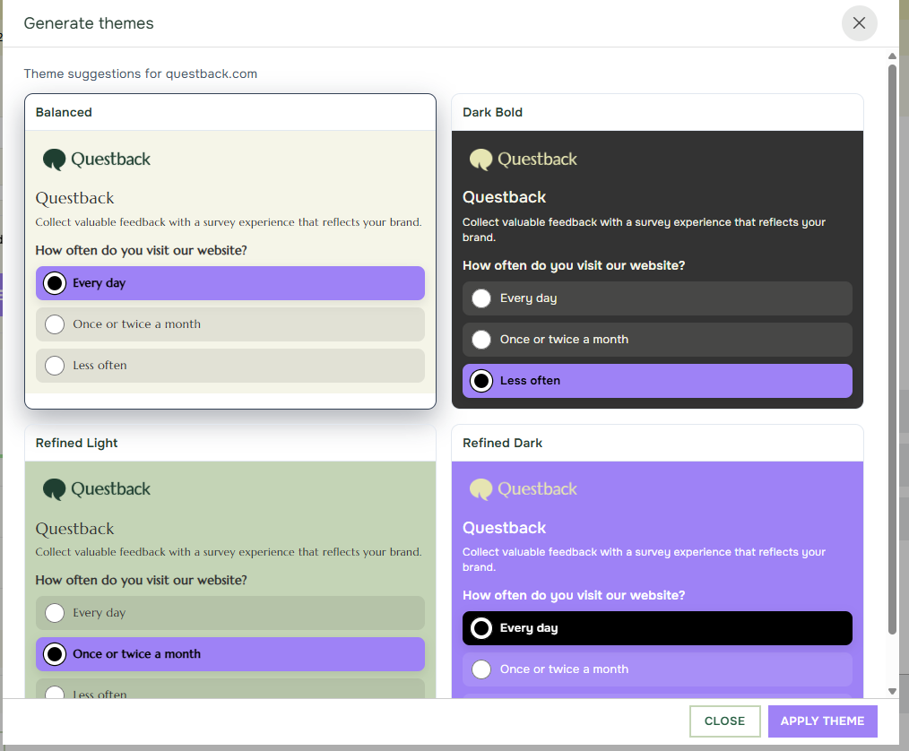 • After entering the domain and confirmation click Generate, the Questback system will then generate one or several Theme suggestions based on your company brand. Review the suggestions and compare the available styles. Depending on the brand assets that are found, the suggestions may vary slightly in color balance and overall appearance. When you find a suggestion you want to use, select it and click Apply Theme.