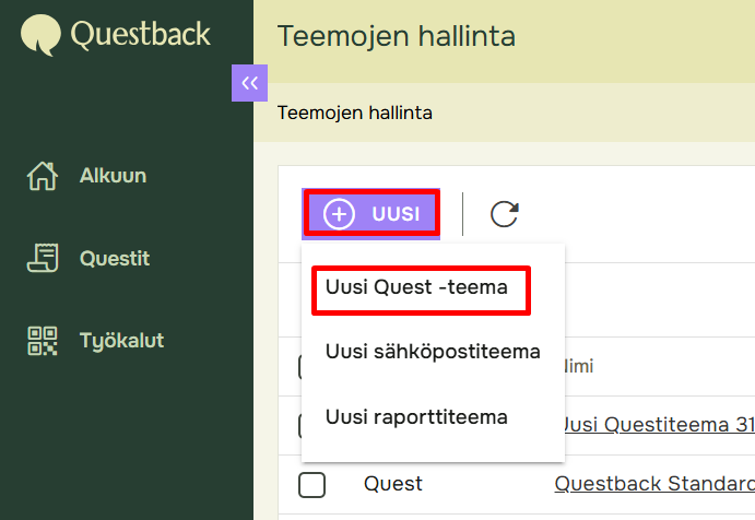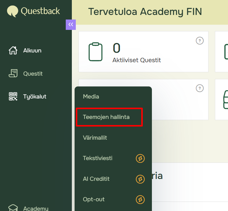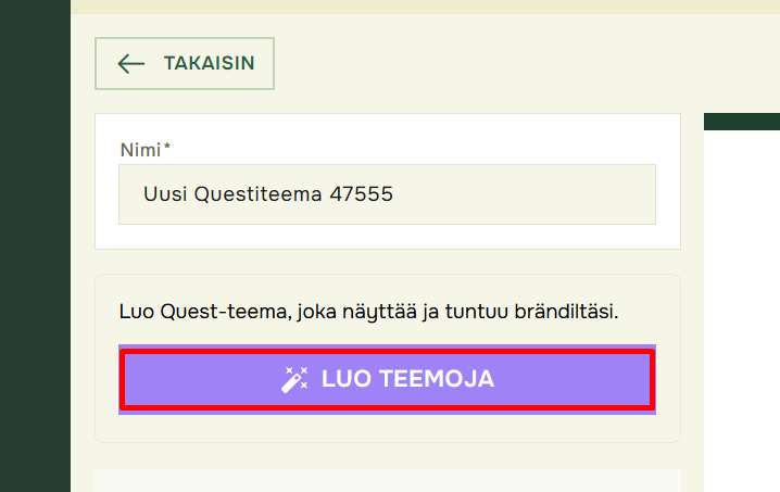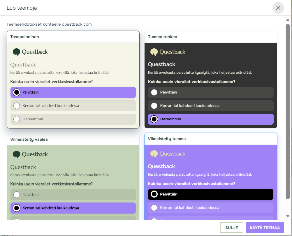 Brändätty Quest-teema auttaa sinua mukauttamaan Questin yrityksesi visuaaliseen identiteettiin käyttämällä automaattisesti brändisi värejä ja logoa. Mukautettuja teemoja voidaan luoda Teemojen hallinta -osiossa ja soveltaa niitä sitten yhteen tai useampaan Questiin.