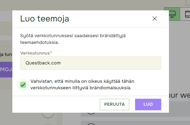 Ennen kuin voimme luoda teemaehdotuksia, sinun tulee vahvistaa, että sinulla on oikeus käyttää verkkotunnukseesi liittyvää brändiä.