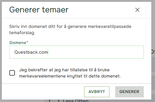 Før vi kan generere temaforslag, må du bekrefte at du har tillatelse til å bruke merkevaren som er knyttet til domenet.