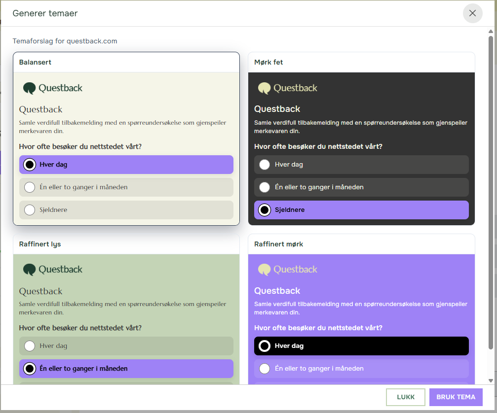 Etter at du har tatt i bruk et forslag, kan du fortsatt justere temaet ved behov. Du kan for eksempel gå gjennom fargene, legge til skrifttyper eller justere andre designelementer før du bruker temaet i en aktiv Quest. Slik får du et godt utgangspunkt, samtidig som du kan finjustere resultatet.
