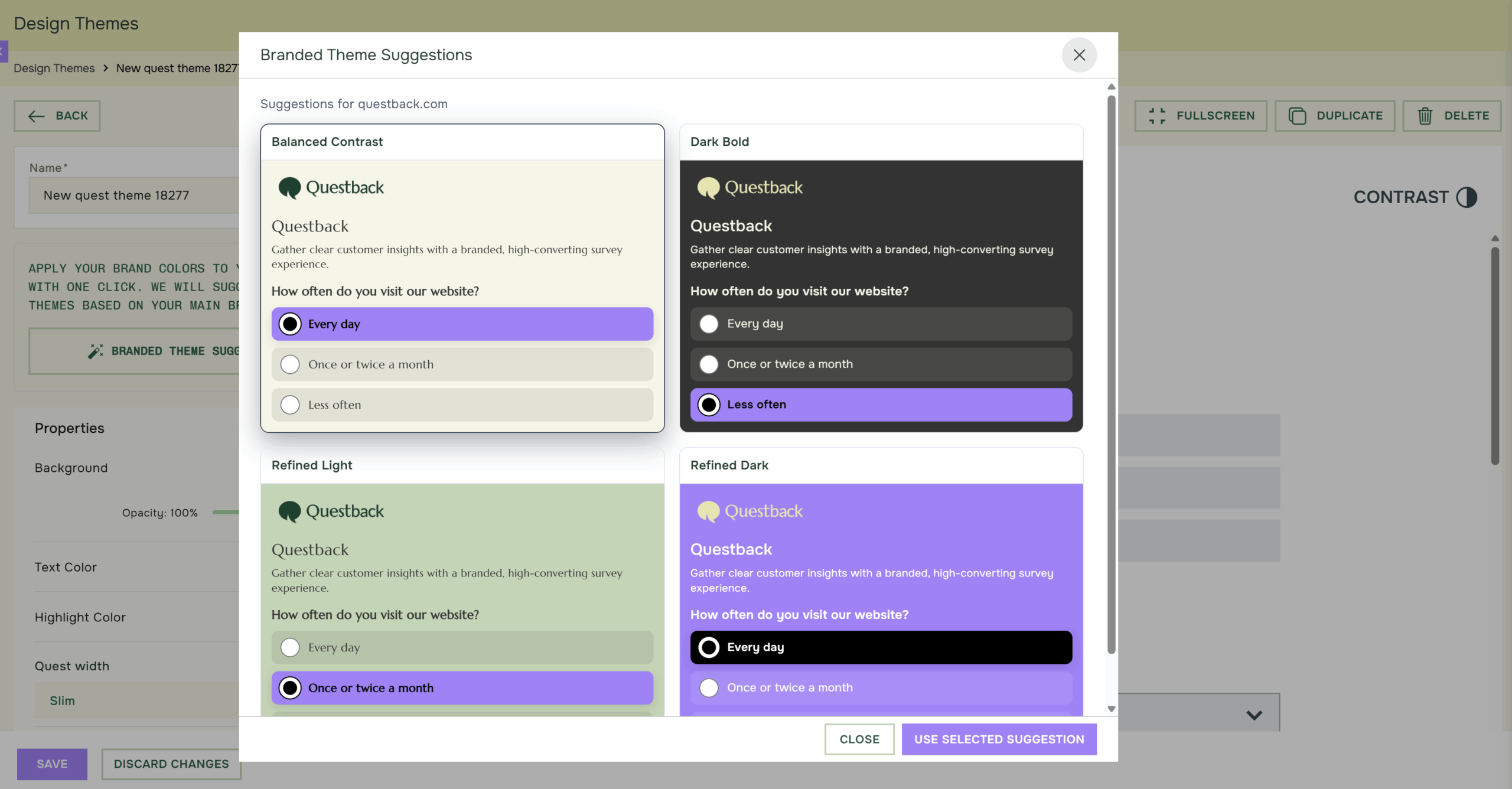 A key part of this release is a new way to speed up theme creation. Questback now generates themes based on your company branding, making it easier to get started with a professional and consistent look. Questback lets you fetch your company brand colors and logo, which are then automatically mapped into your theme. Based on these brand assets, the system generates up to four theme suggestions for you to choose from. Saving our users the time spent building themes while making it easier to create Quests that feel polished, consistent, and on-brand from the start.
